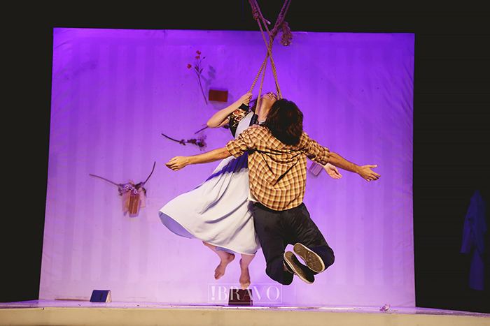 Երբ մարդը սիրում է, նա գետնից կտրվում է, ճոճ է տալիս ու ճախրում։ Այստեղ էլ վերևից երկու ամուր թել էր կախված, որոնց վրա են կառուցվել սիրո տեսարանները։ Սա, իհարկե, գեղեցիկ ու հետաքրքիր բեմադրական լուծում է սերը ներկայացնելու համար, բայց նաև բարդ է դերասանների համար։ Դրա համար անհրաժեշտ է ֆիզիկական պատրաստվածություն և հավասարակշռություն։ Դերասանները կարողացել են հաղթահարել այդ տեսարանների բարդությունները։